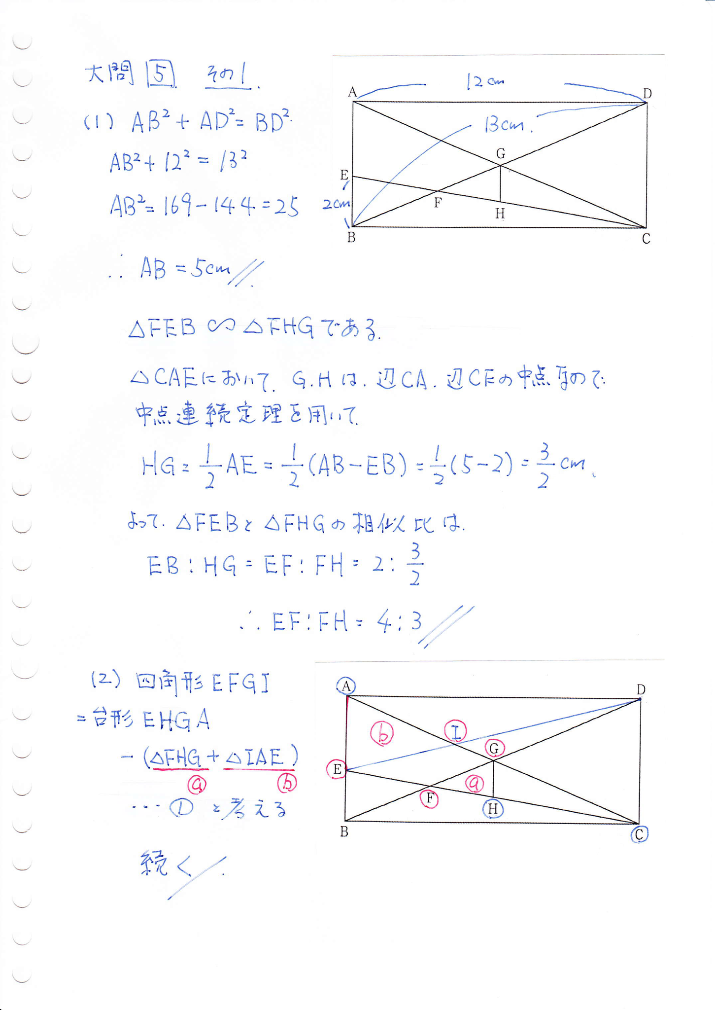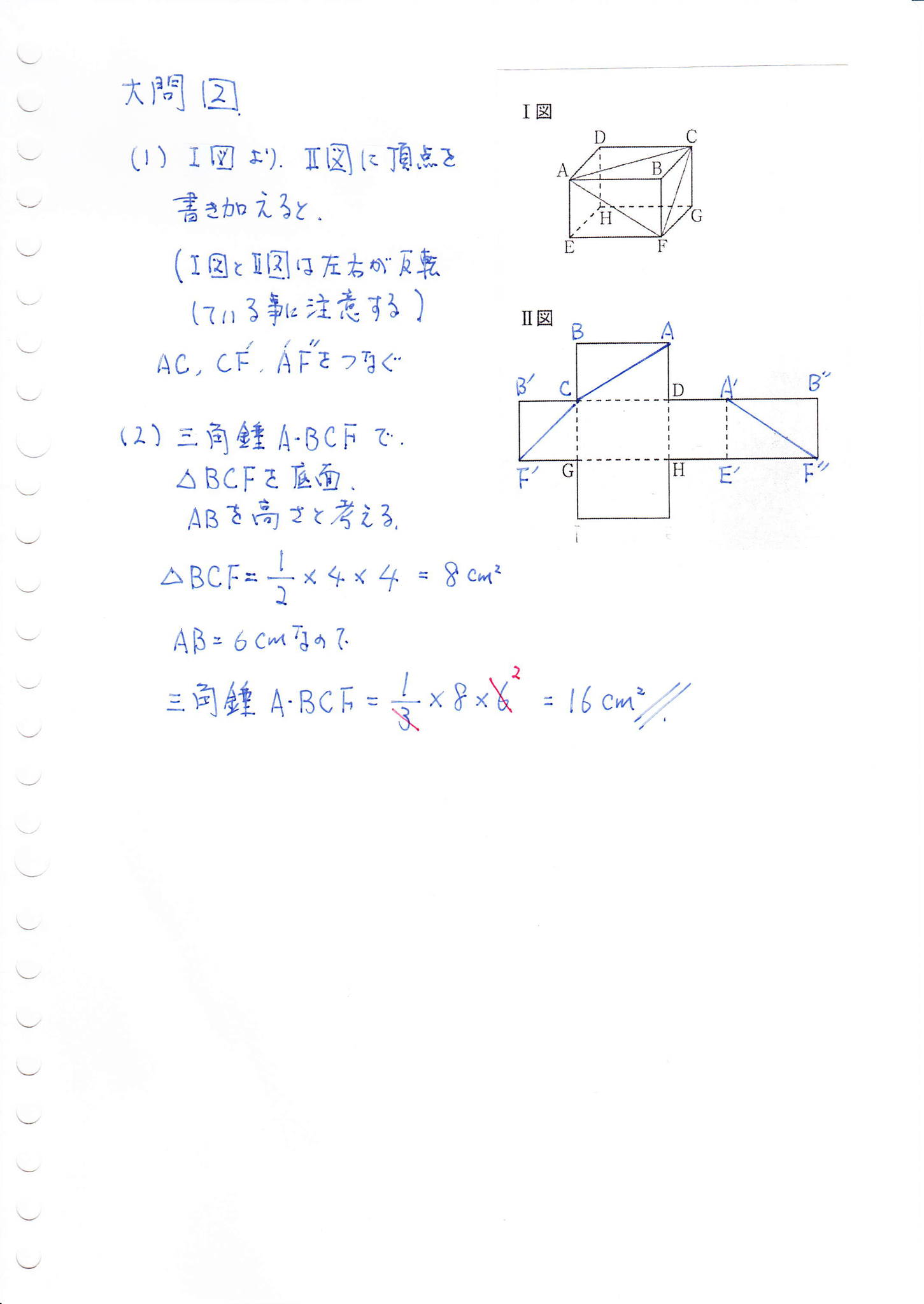 (1)は展開図に各頂点を加えてといて下さい。見取り図と展開図の左右が反転していることに注意。(2)△ABC,△ABF,△CBFの何れかを底面として、その面に垂直な辺を高さとして体積を計算します。